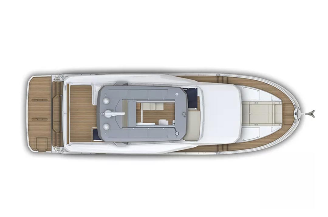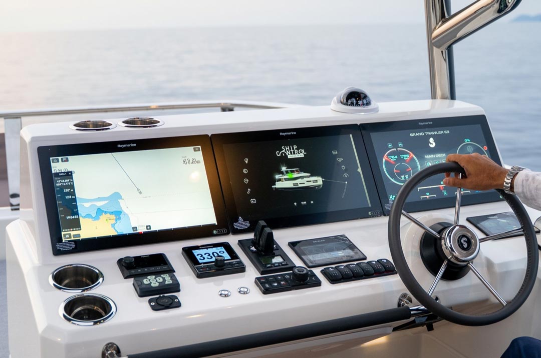 Der neu gestaltete Steuerstand – inspiriert vom Swift Trawler 54 – verfügt über schwimmende MFD-Bildschirme und ein neues elektrisches Xenta-Steuersystem, das ein modernes, reaktionsschnelles und angenehmes Steuererlebnis bietet.