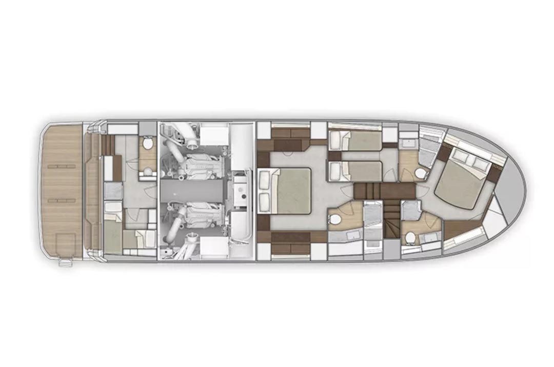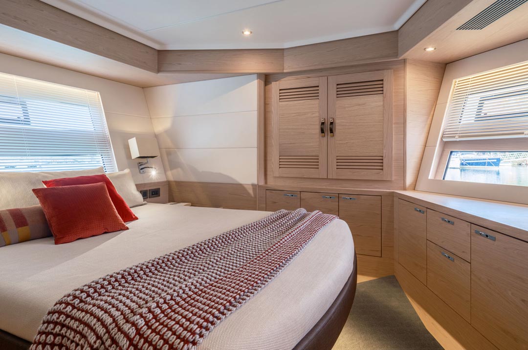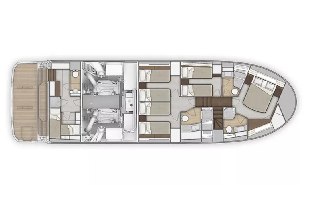 Kommen Sie an Bord und entdecken Sie Innenräume, die das Leben auf See bereichern. Erhältlich in drei oder vier Kabinenlayouts, bietet jede Kabine luxuriösen Komfort mit geräumigen Badezimmern, hochwertigen Armaturen und eleganten Oberflächen. Dank der zentral gelegenen Kombüse sind Sie immer nur wenige Schritte von den wichtigsten Bereichen der Yacht entfernt – dem Steuerstand, der Flybridge, dem Salon und der angrenzenden „Terrasse auf dem Meer“.