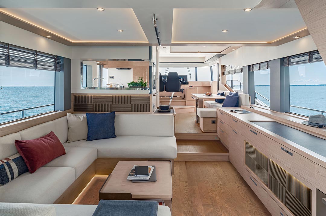 Die Ergonomie ist bemerkenswert gut – alles ist dort, wo es sein sollte – und die Sitzanordnung setzt neue Maßstäbe in Sachen Komfort, sowohl bei den Kapitänssesseln als auch beim schönen Tagesbett an Backbord.