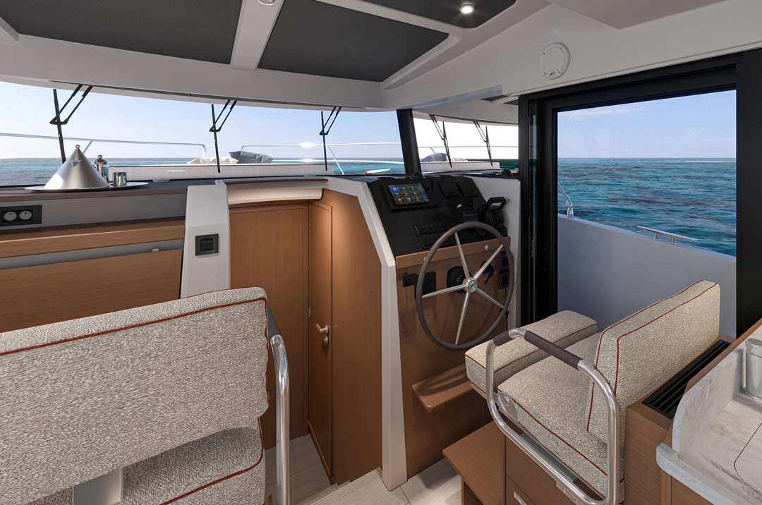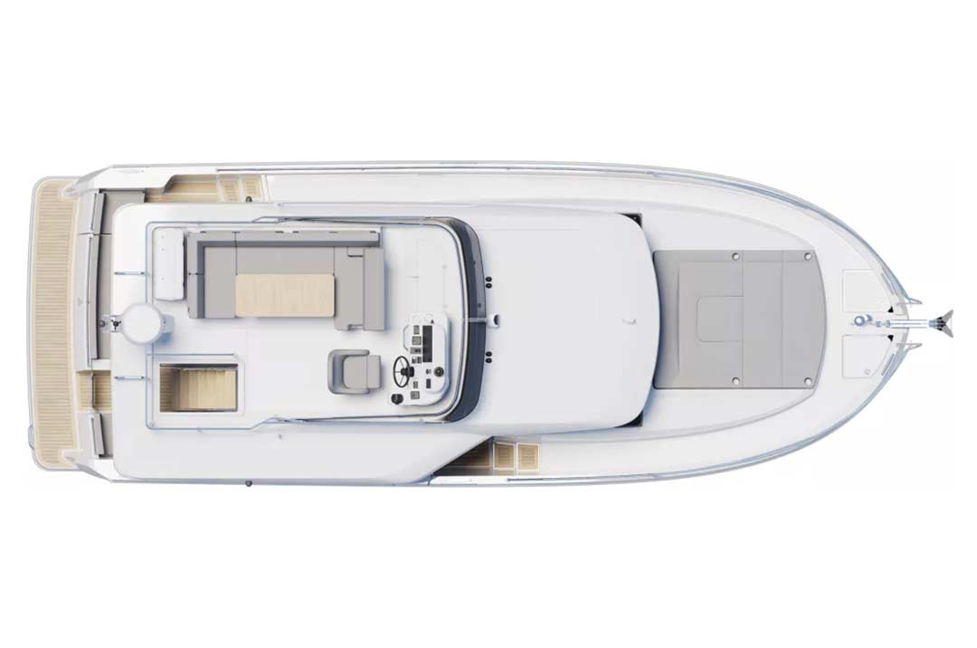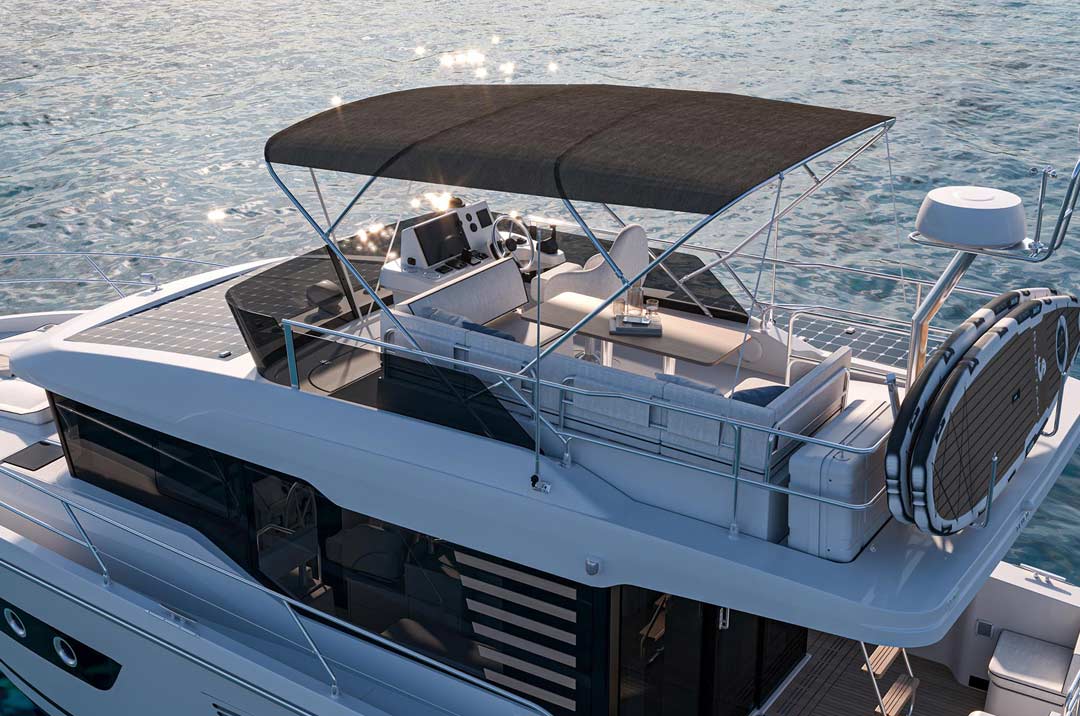 Die atemberaubende Flybridge-Konfiguration verfügt über einen erhöhten Steuerstand mit hervorragender Sicht sowie einen sehr geselligen U-förmigen Sitz mit einer nach vorne adaptiven Rückenlehne, einem Tisch und einer eingebauten Kühlbox.