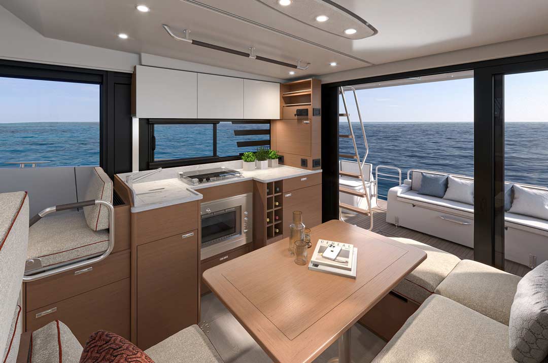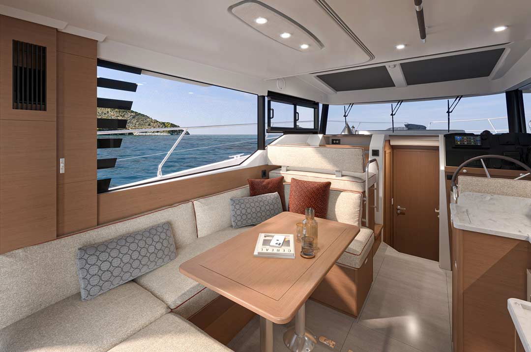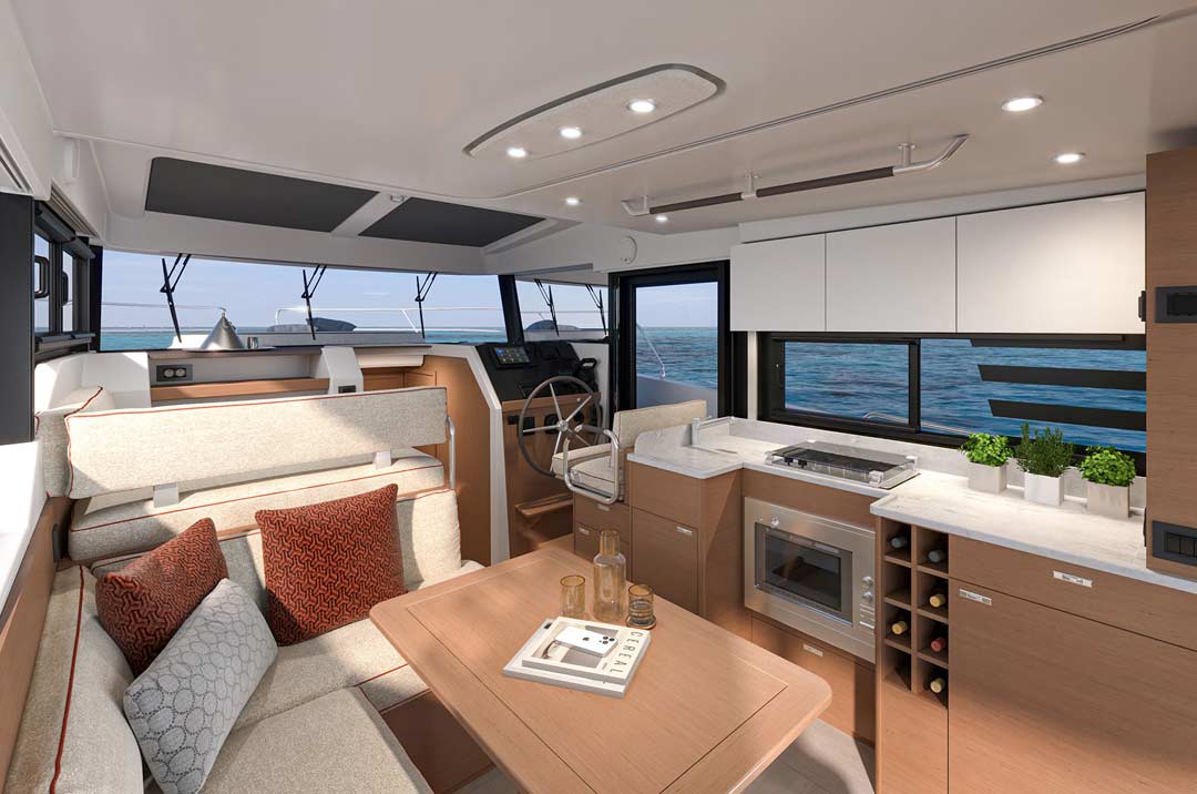 Social Mixing ist das Herzstück der Designelemente auf der Decksebene, wobei die komplementäre U-förmige Küche und das Sofa das Gefühl von Raum schaffen. Dies wird durch umfangreiche Aufbewahrungsmöglichkeiten und eine große Kühl- und Gefrieroption unterstützt. Das Sofa lässt sich schnell in eine Doppelkoje mit Sichtschutzvorhang verwandeln. Weiters haben wir einen innovativen Hubtisch eingeführt, der sich intelligent in einen bequemen Arbeitsplatz verwandeln lässt.