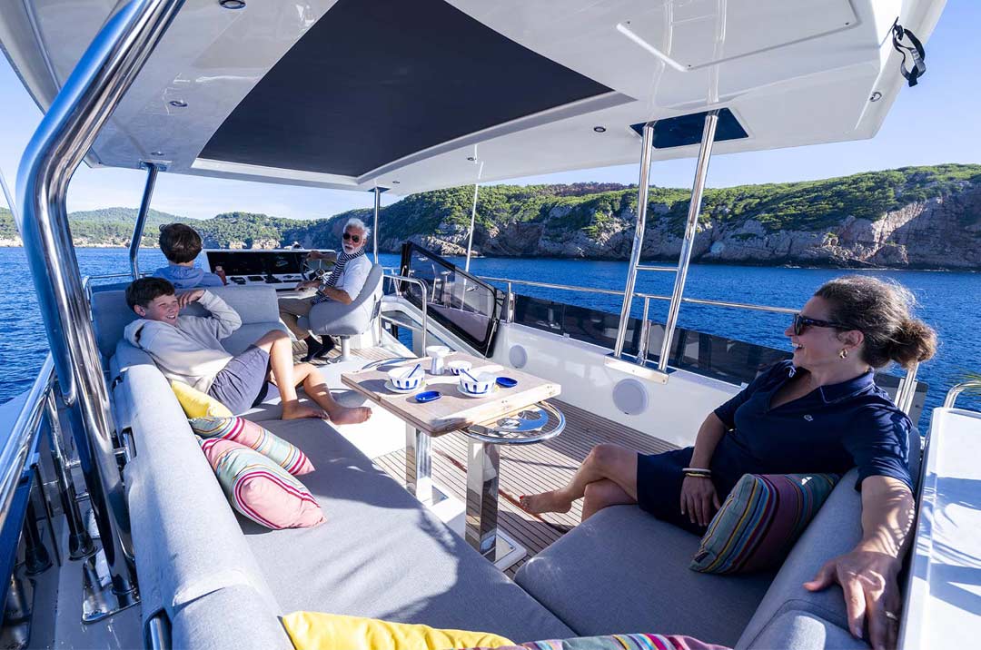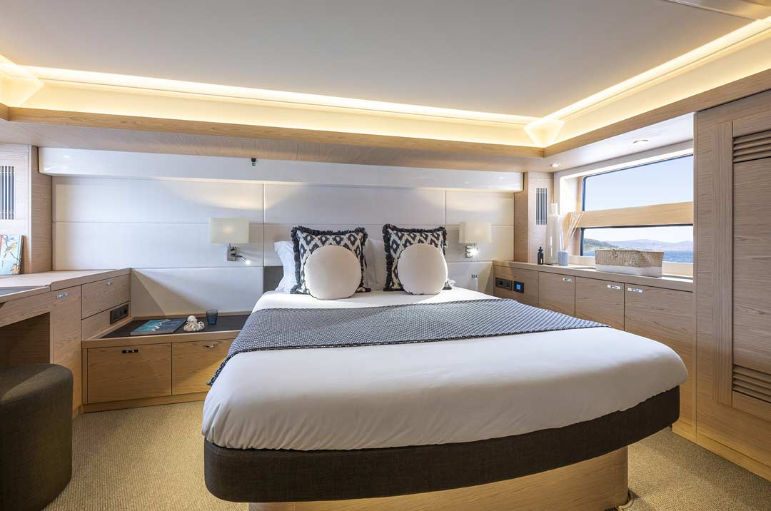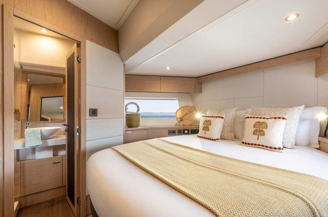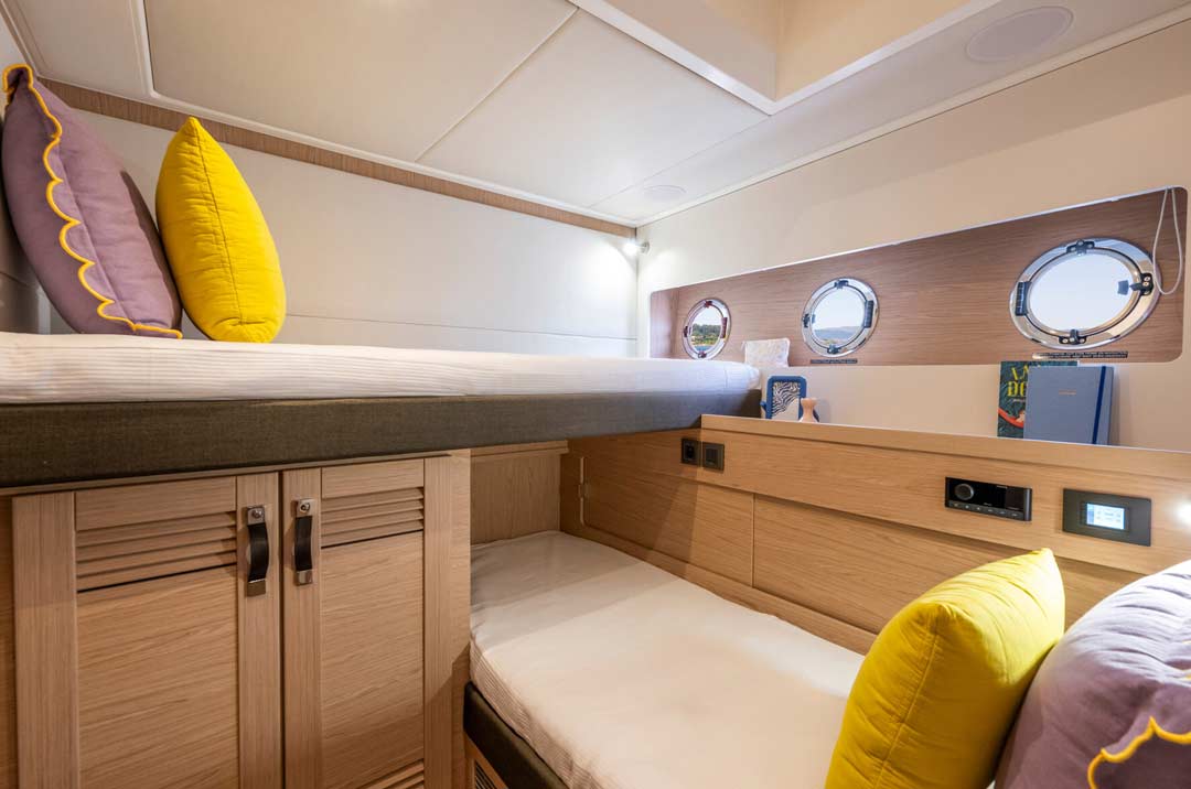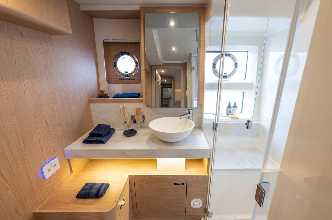 Gebaut mit sechs Kabinen, mit der Option für eine zusätzliche Einzelkabine, ist das Layout perfekt für lange Familienkreuzfahrten. Die separaten Duschkabinen sind mit Corian-Böden ausgelegt und verfügen über eine zusätzliche Regendusche im eigenen Bad der Eignerkabine mit voller Breite.