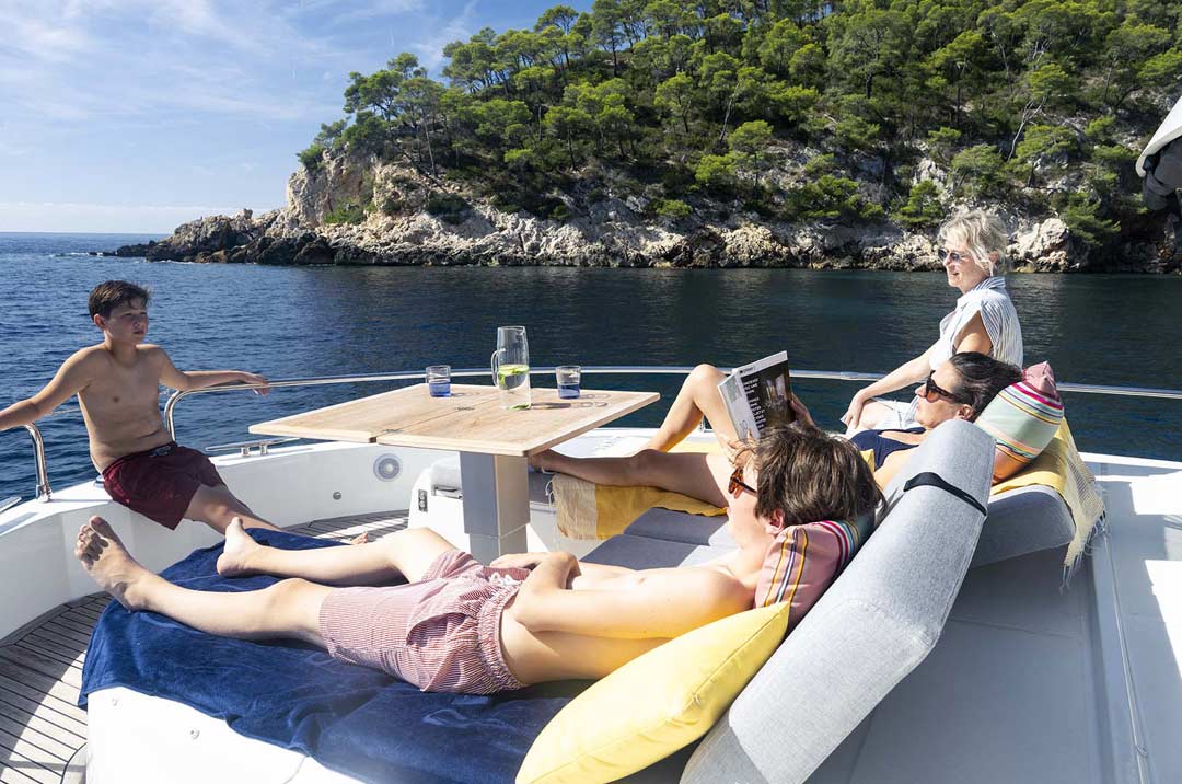Der innovative Swift Trawler 54 verfügt über ein atemberaubendes Cockpit und eine geräumige Flybridge, alle mit weichen Sitzen und luxuriösen Details. Freuen Sie sich auf eine Terrasse mit Meerblick. Das Heck verfügt über einen 400 kg schweren Tenderlift, ausreichend Stauraum für Kajaks und Paddleboards und eine hydraulische Badeplattform mit adaptiven Beiboot-Unterlegkeilen. Auf dem Vordeck verwandelt sich der U-förmige Sitzbereich mit eingelassenem Tisch leicht in eine riesige Sonnenliege, darunter befindet sich ein spezieller Fender-Stauraum.