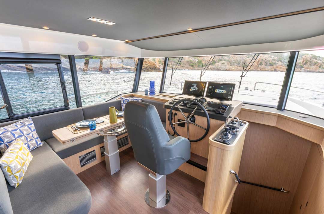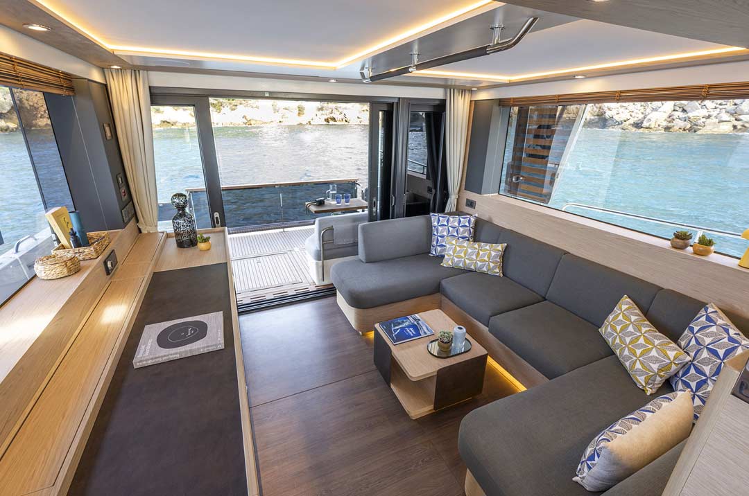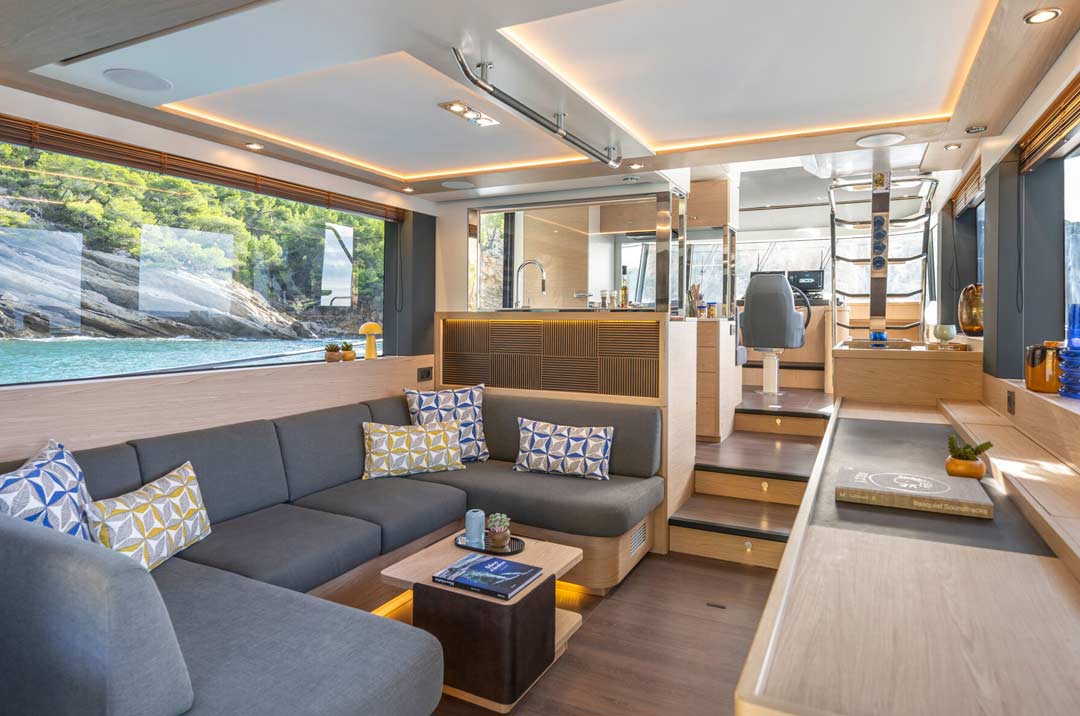 Das visuell beeindruckende Interieur verfügt über eine gut ausgestattete Kombüse mit einer erhöhten Passagemaker-Essecke, einen großen Salon und eine attraktive „architektonische“ Flybridge-Treppe.