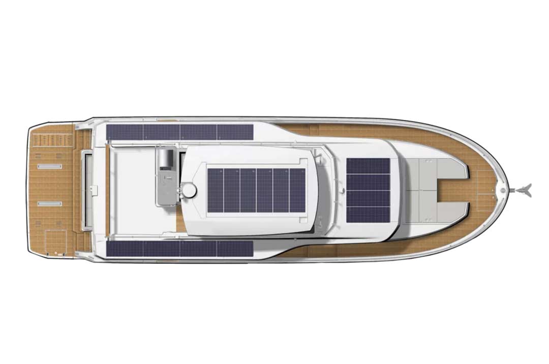 Die sanfte „S“-Scherlinie, die zum Bug hin ansteigt, verleiht dem Rumpf eine zielgerichtete, zeitlose Haltung. Die saubere, flache Flybridge über dem durchgehenden Glasaufbau sorgt für eine allgemeine Leichtigkeit und behält gleichzeitig die Festigkeit bei, die für einen echten Trawler erforderlich ist.